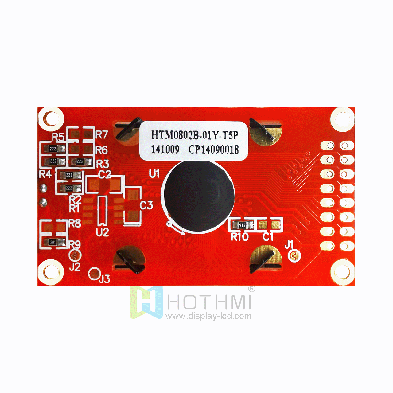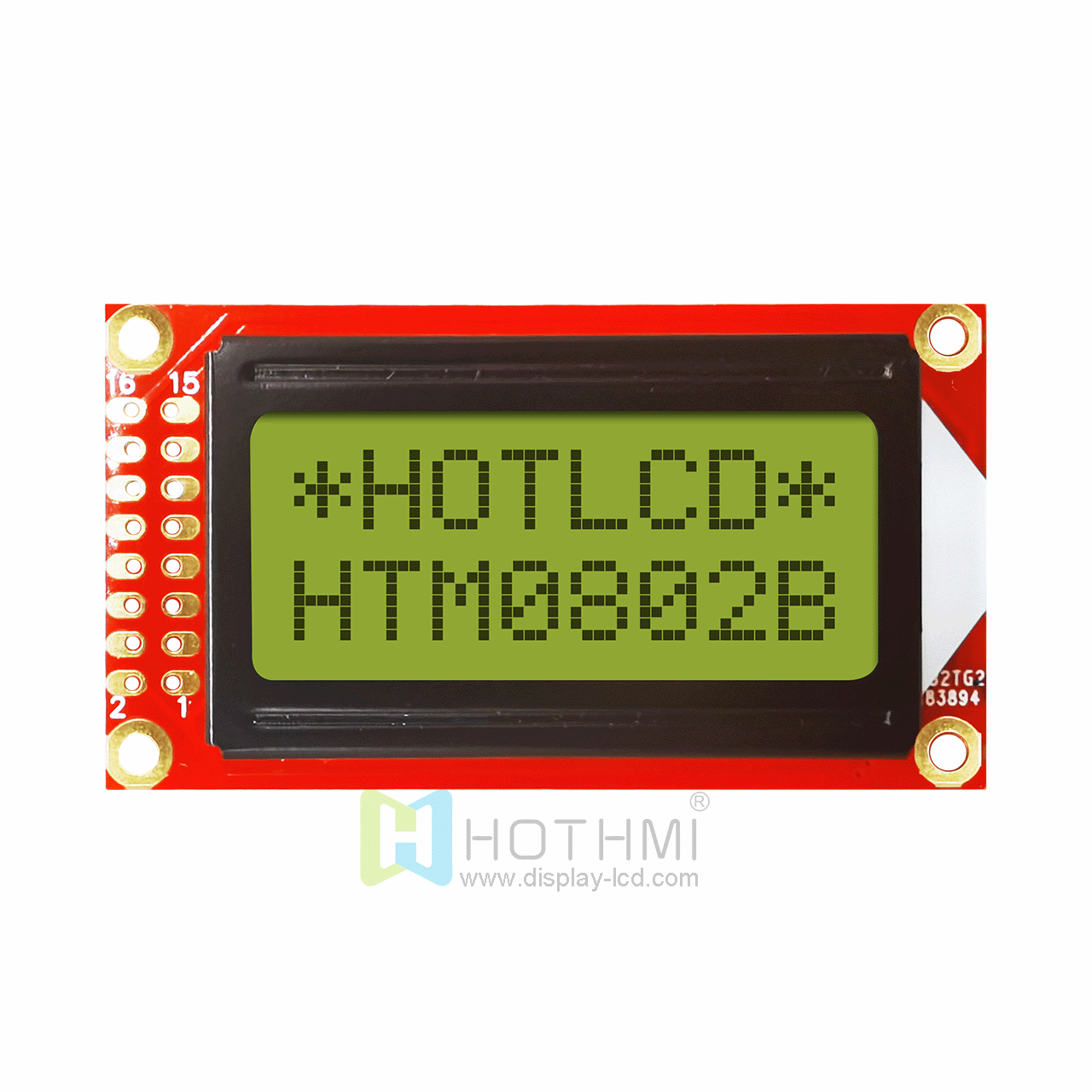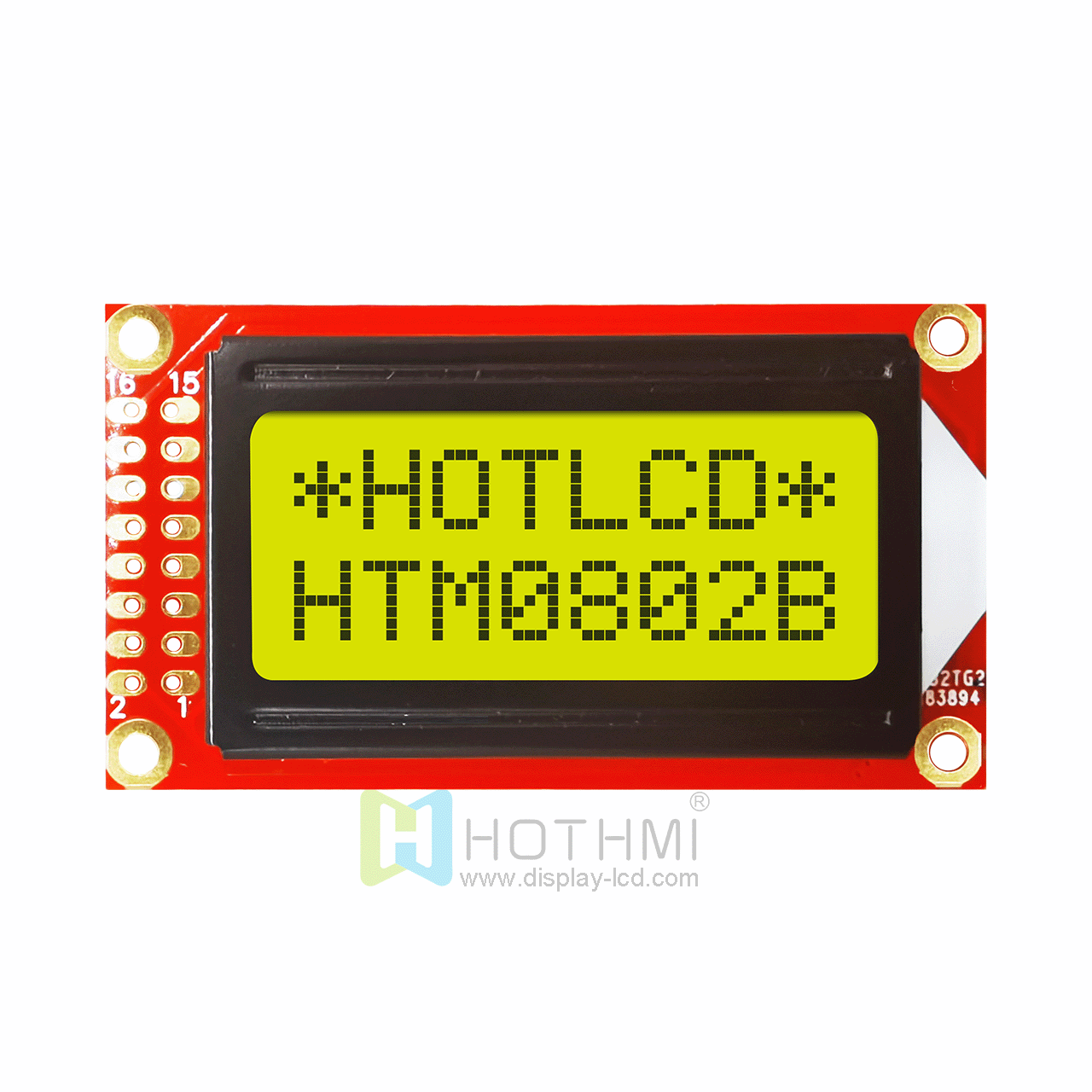 HTM-0802B-01Y-T5P-V03 | 2X8 Character LCD | STN+Yellow-Green Film Display with Yellow-Green Side Backlight 5.0V display is an 8-character, 2-line character LCD that displays dark characters on a yellow-green background. This semi-transmissive single-line display operates on a 5.0V supply voltage. Compact design, multi-color LCD, with an optimal 6:00 viewing orientation to provide you with the best viewing experience. It has a wide operating temperature range, from as low as -20°C to as high as 70°C. It has a unique side color backlight that enhances visibility and readability in low-light environments. The LCD display has a built-in ST7066U controller, which guarantees high compatibility with a variety of interfaces and development boards such as Arduino.