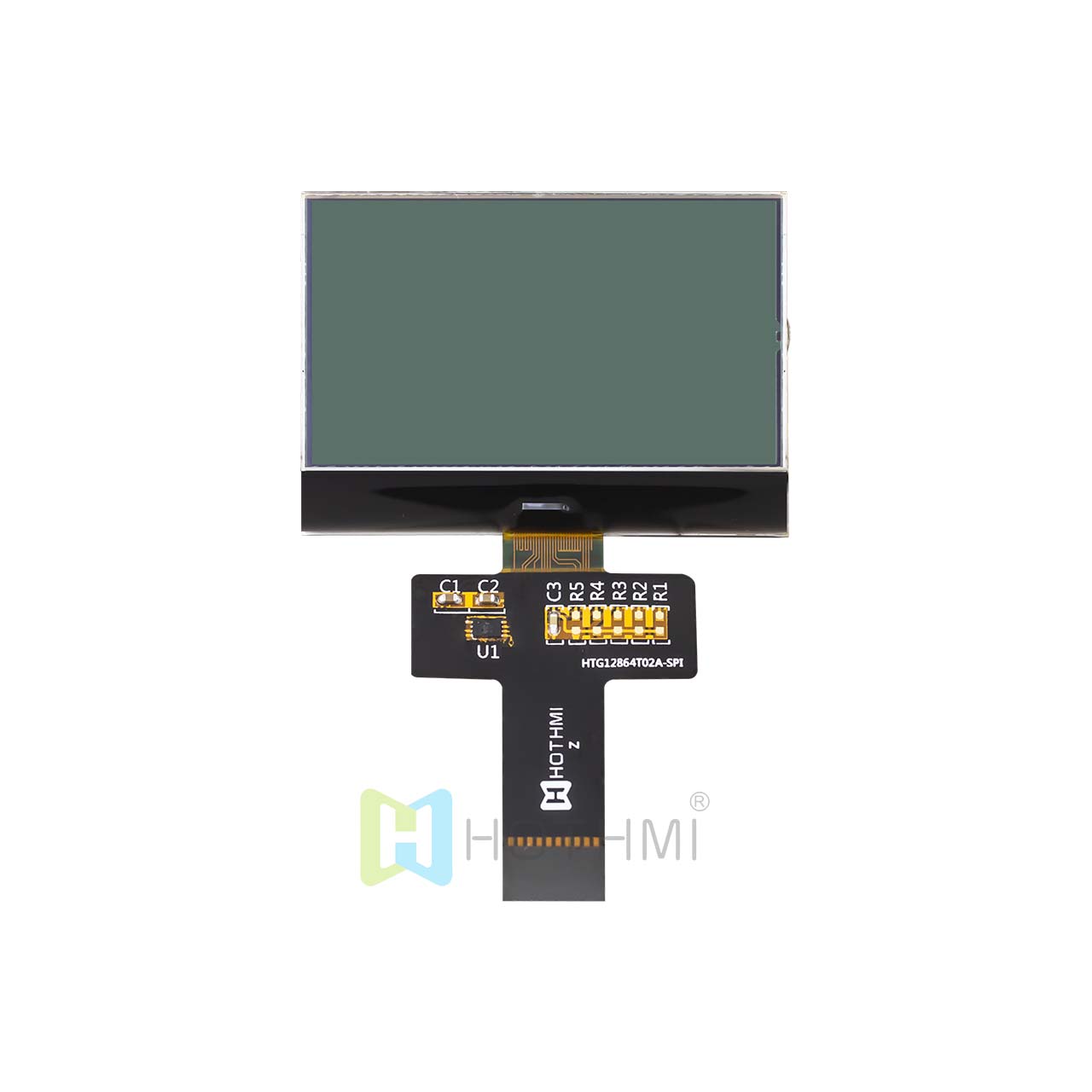 This 2.2" HOT Display 128x64 Graphic Chip on Glass (COG) LCD module displays blue pixels on a gray background. This transmissive LCD display is engineered to reflect the image to the viewer in ambient light through the reflection of the polarizer and to provide optimal visibility and impressive colors when used in darker environments through the backlight. The display has a powerful built-in backlight to provide high contrast and ensure readability of all graphics on the screen.