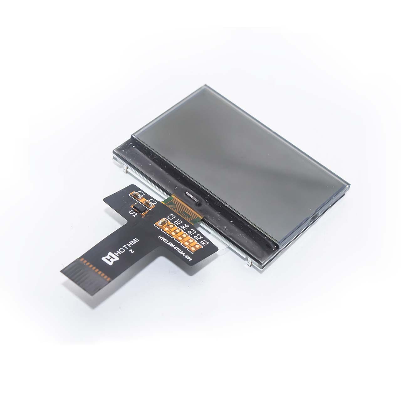 This 2.2" HOT Display 128x64 Graphic Glass Chip (COG) LCD module displays white pigments on a blue background. This transmissive LCD display is carefully designed to allow the backlight to fully penetrate the ambient light under the full penetration of the polarizer, making the display brighter and allowing viewers to clearly see the image; when used in darker environments, the backlight makes the graphics clearly visible, providing optimal visibility and impressive colors. The display has a powerful built-in backlight to provide high contrast and ensure readability of all graphics on the screen.