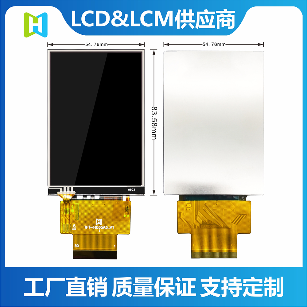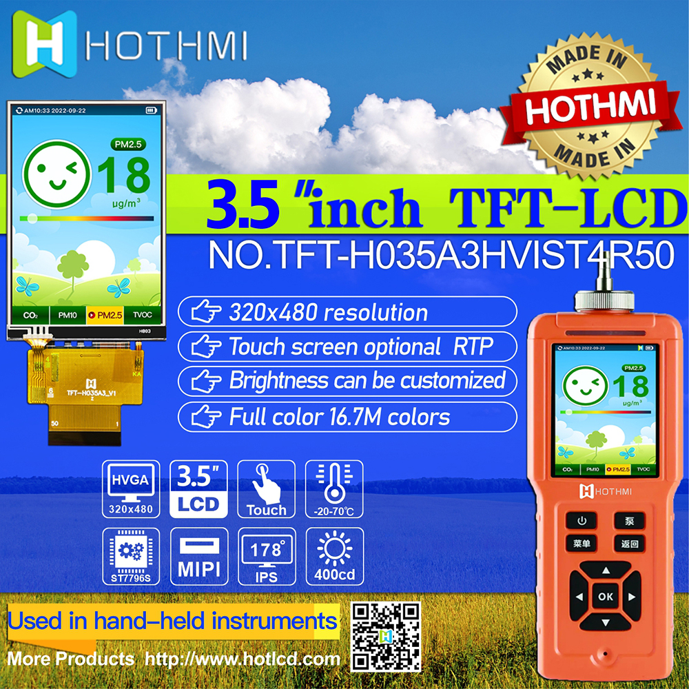 Product Description The TFT-H035A3HVIST4R50 is a 3.5-inch wide temperature IPS TFT-LCD monitor with a projected resistive touch screen with a resolution of 320X480 pixels. The module has built-in ST7796S driver IC, which supports MIPI fully compatible interface. TFT-H035A3HVIST4R50 adopts IPS panel, which has the advantage of wider viewing angle, left: 80/right: 80/up: 80/down: 80 degrees (typical value), contrast ratio 800:1 (typical value), brightness 400 nits (typical value) value), glare panel, 1:1.5 aspect ratio. Support I2C interface and single touch function. The H035A3H model has a projected resistive touch panel (PCAP), and the TFT-H035A3HVIST4R50's supply voltage (VCC) is 2.5V to 3.0V, typically 2.8V. It can operate at temperatures from -20°C to +70°C and storage temperatures from -30°C to +80°C.