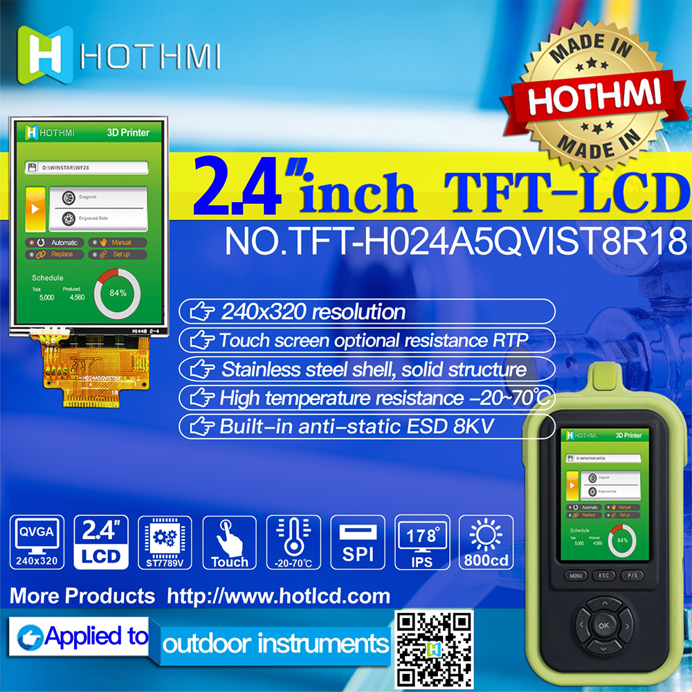 TFT-H024A5QVTST8R18 is a 2.4-inch wide warm IPS TFT-LCD display with a project-resistive touch screen with a resolution of 240x320 pixels. Module built-in ST7789V driver IC, support SPI interface. The TFT-H024A5QVTST8R18 uses an IPS panel with the advantage of a wider viewing Angle, left: 80/ right: 80/ top: 80/ bottom: 80 degrees (typical), contrast 800:1 (typical), Brightness 800 nits (typical)) value), glare panel, 16:9 aspect ratio. The H024A5 model has a projection resistive touch panel (PCAP) and the TFT-H024A5QVTST8R18 has a supply voltage (VCC) of 3.0V to 3.6V, with a typical value of 3.3V. It can operate at temperatures from -30°C to +80°C and storage temperatures from -30°C to +80°C.