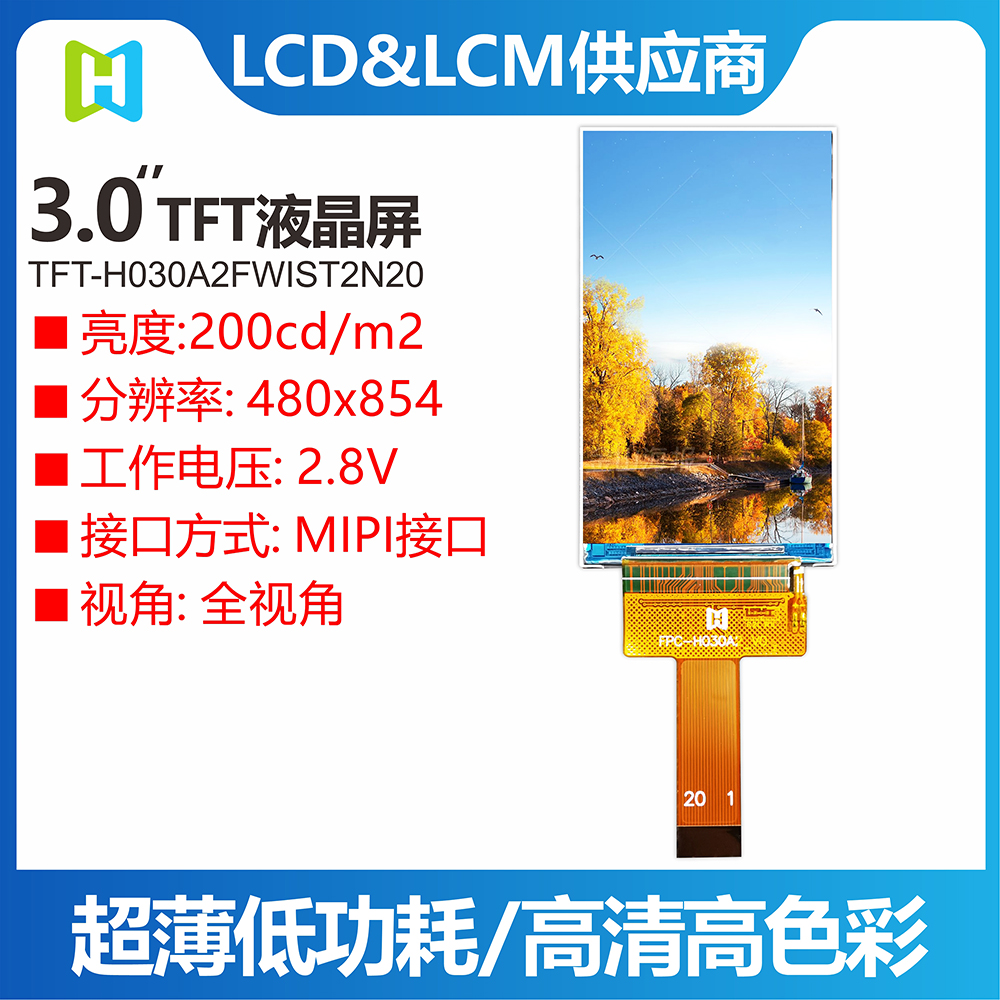 The TFT-H030A2FWIST2N20 is a 3.0-inch full-color TFT LCD module with a resolution of 480x854 pixels and an aspect ratio of 1:1.75. The TFT module adopts ST7701S driver IC and supports MIPI interface. The TFT module with IPS panel has the advantage of wide viewing angle (left 80 degrees/right 80 degrees/up 80 degrees/down 80 degrees), a typical contrast ratio of 800:1, and a module brightness of up to 200 nits (typical). The operating temperature range of the module is -30℃~+85℃, and the storage temperature range is -30℃~+85℃.
