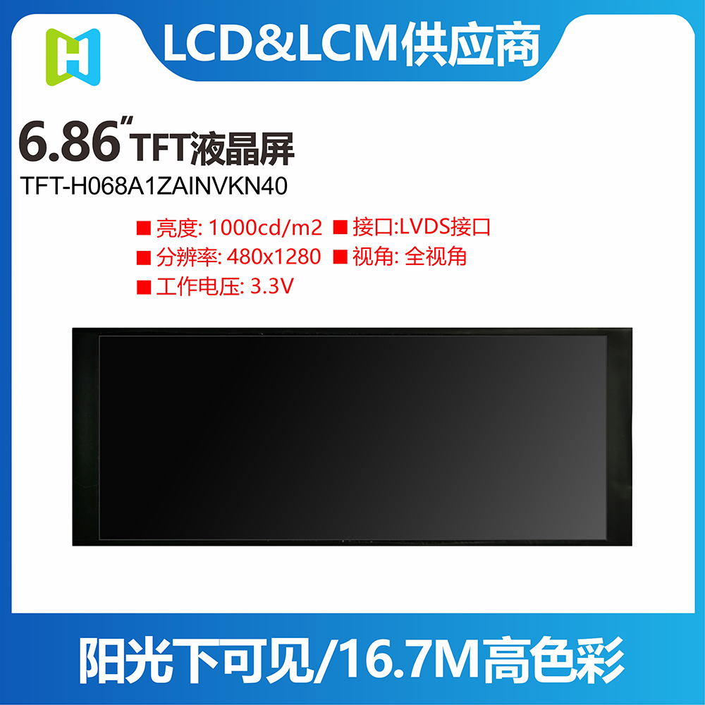 Location:Home  >  Product center  >  TFT display  >  TFT round screen | TFT square screen | long strip TFT display  >  6.86寸TFT液晶屏/長(zhǎng)條形/480*1280分辨率/IPS/LVDS 4L 接口/TFT-H068A1ZAINVKN40