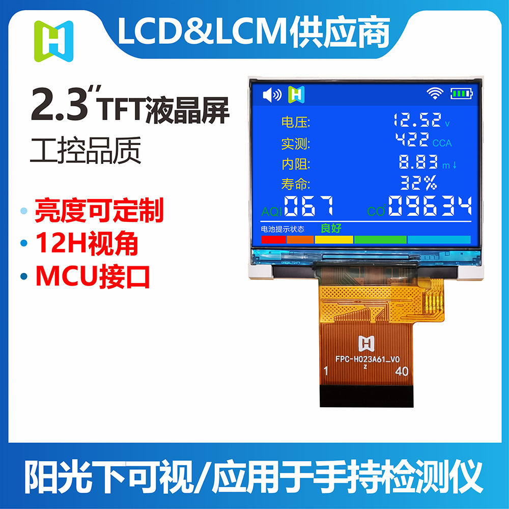 TFT-H023A61LQTIL2N40is an industrial-grade horizontal display TFT LCD with a resolution of 320*240 pixels, a typical brightness of 400 nits, a viewing angle of 12H, and a supply voltage (VCI) of 2.8V~3.2V , the typical value is 2.8V. The working temperature is -20℃~+70℃, and the storage temperature is -30℃~+80℃. The products are used in various small smart devices, home appliances, monitors, etc.