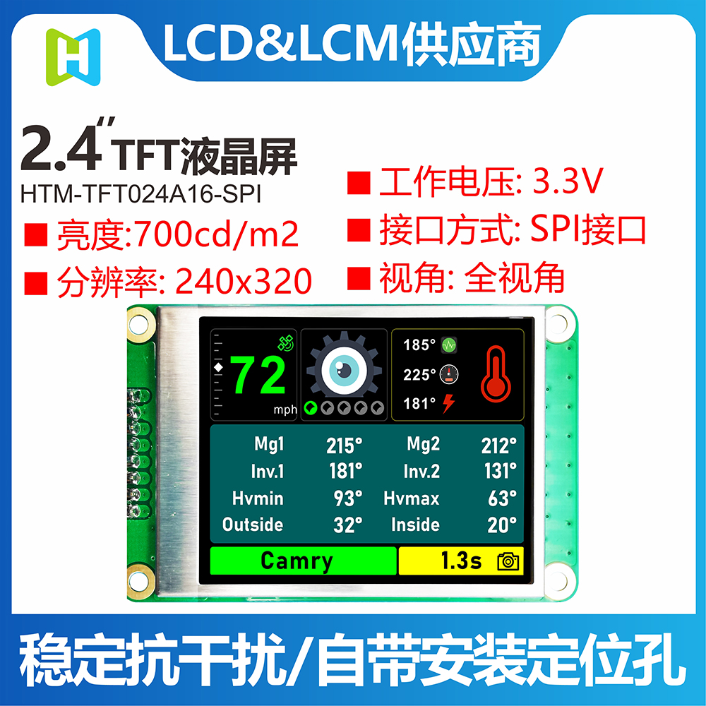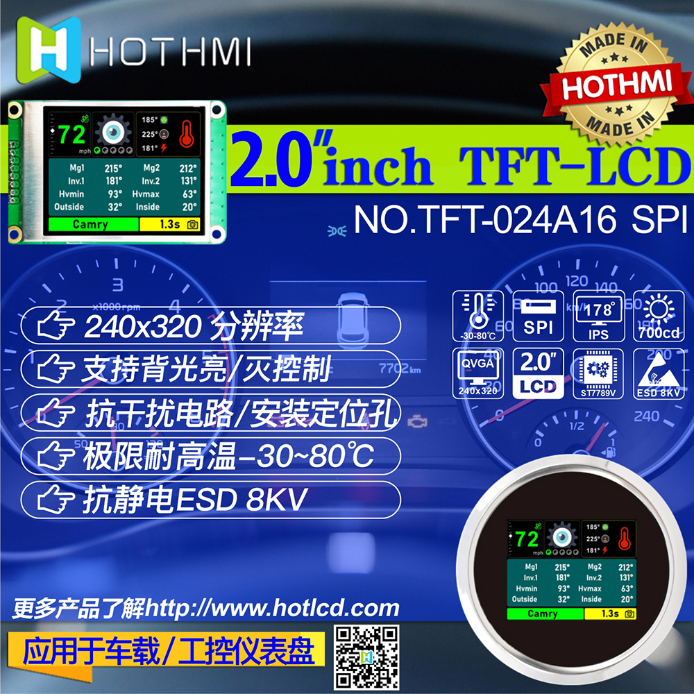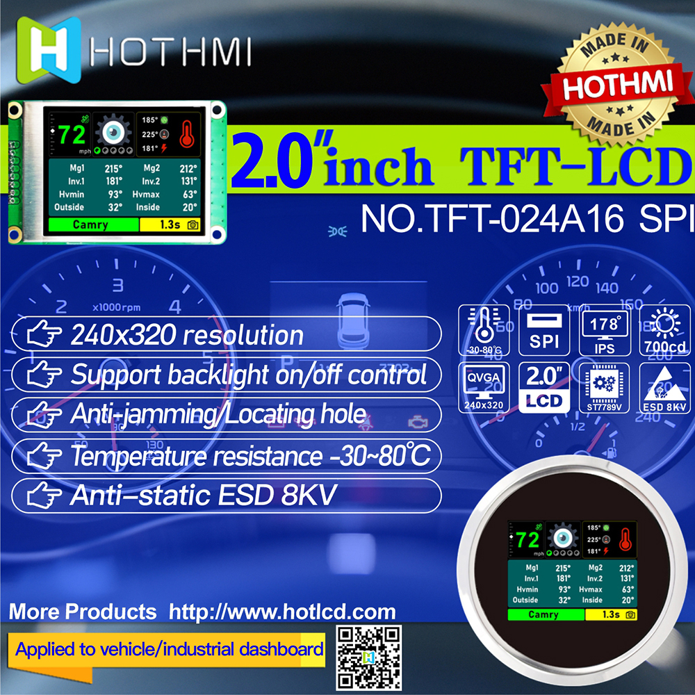 HTM-TFT024A16-SPI is a 2.4-inch TFT color LCD panel display screen carefully designed by HOTLCD R&D team, 240*320 resolution, high image quality, wide viewing angle, 65K/262K true color, built-in ST7789V controller, support MCU SPI-4L interface , 8PIN plug-in FPC can be connected to the motherboard (optional connector), single power supply DC 3.3V power supply. The TFT module can be equipped with a touch screen and all materials are RoHS compliant. Widely used in various instruments, smart devices, analytical instruments, handheld instruments, driving recorders, etc.: 8051, PIC, AVR, ARDUINO, ARM, Raspberry Pi, etc.