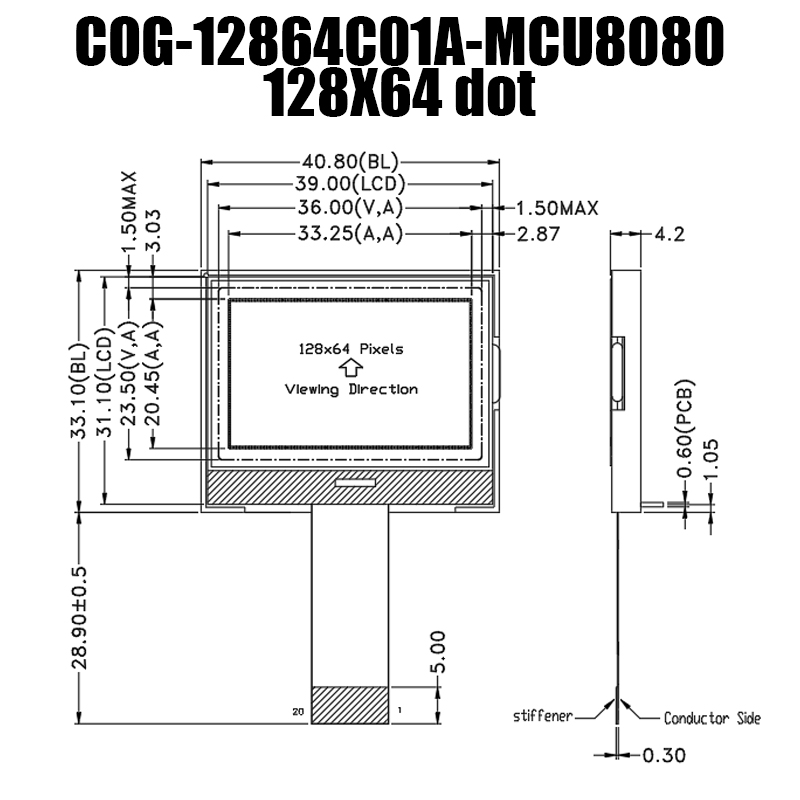 With dimensions of 40.8x33.1x4.2mm, a viewing window size of 36.0x23.5mm, and a display size of 33.25x20.45mm, our display module provides a clear and expansive viewing experience. With a resolution of 128x64, it is capable of displaying rich graphics and information.