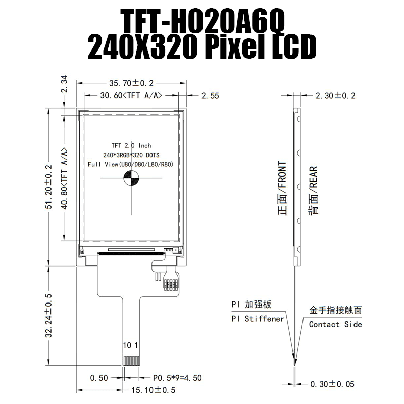 H020A6QVIST6N10 is a portrait mode micro TFT display, if you would like to use it as landscape mode, please contact with us for more technical support. This 240x320 TFT LCD is featured with brightness 600 cd/m2(typical value), it can be operating at temperatures from -30℃ to 80℃; its storage temperatures range from -30℃ to 80℃.