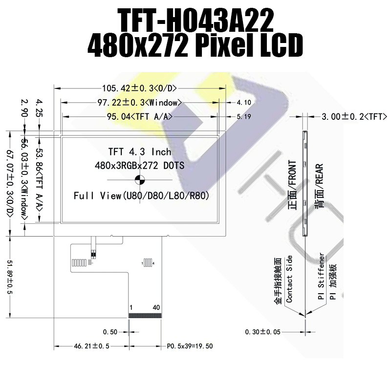 TFT-H043A22WQISTKN40 | 4.3 inch sunlight readable LCD | 480x272 pixels | SPI+MCU interface | FFC connection | optional touch screen