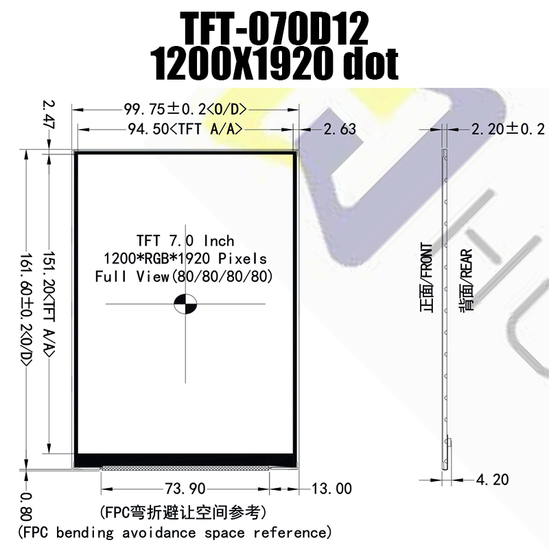 This 7.0 inch TFT LCD display has a 1200x1920 resolution screen with IPS technology, better color reproduction, better image consistency, and better optical characteristics at any angle. For extra protection, this 24-bit true color TFT . This 7.0" display is RoHS compliant with MIPI-4L interface, and does not include a touchscreen. This 7.0" IPS display has been designed with the same mechanical footprint and pinout and includes the same HX8279 driver IC as the TN display, making this a compatible replacement option for the TN models.