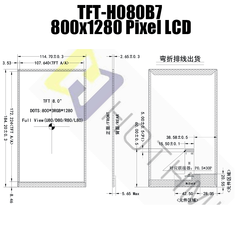 Location:Home  >  Product center  >  TFT display  >  TFT display standard products | Full-view TFT color screen | High-brightness series TFT  >  8.0 英寸 800x1280 IPS LCD 顯示屏 MIPI NV3051F1 TFT 模塊陽(yáng)光下可讀 TFT-H080B7HDINV6N30