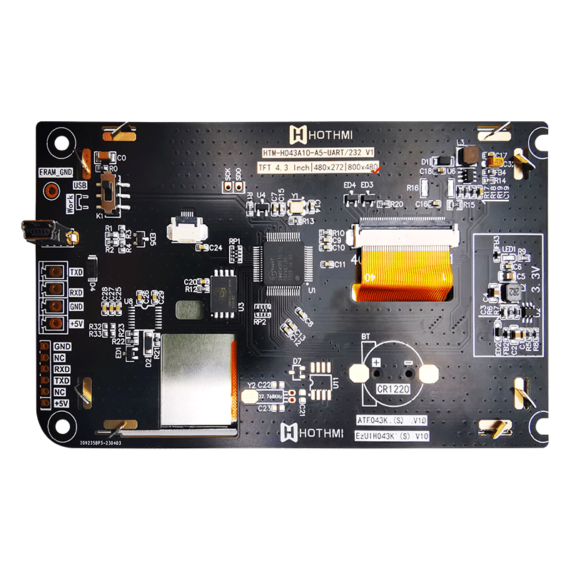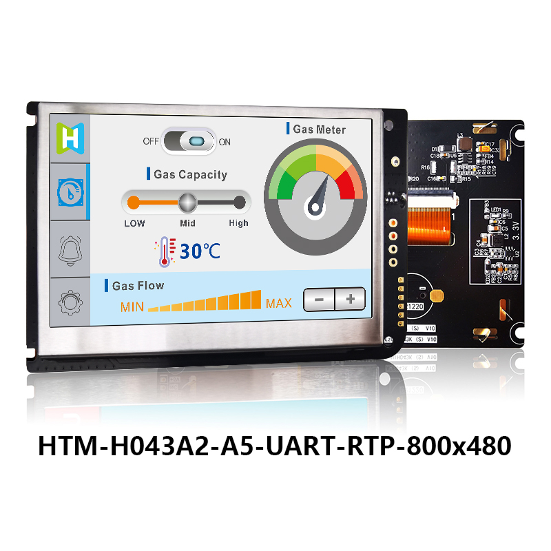 HTM-H043A2-A5-UART-RTP | 4.3" IPS LCD Display | 800x480 dots | LCD Controller Board | Luminance 500cd/m2 | Interface UART(TTL) | TFT MODULE | -20°C ~ 70°C | Resistive touch screen