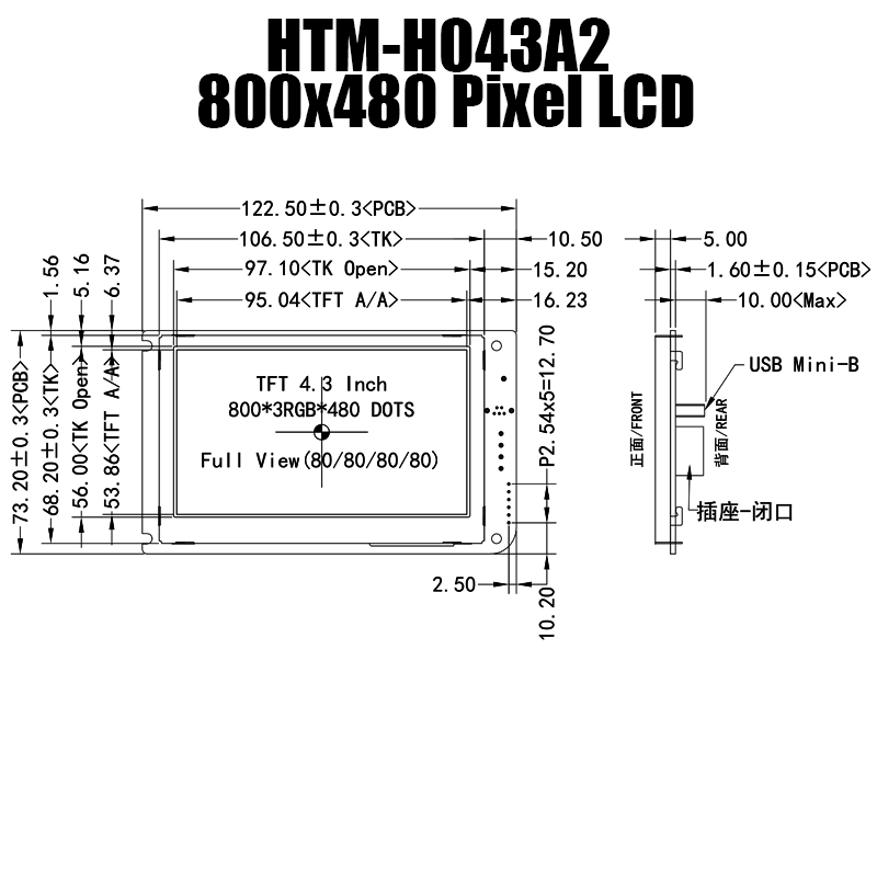 4.3-inch diagonal color TFT screen, standard non-touch/resistive touch/capacitive touch