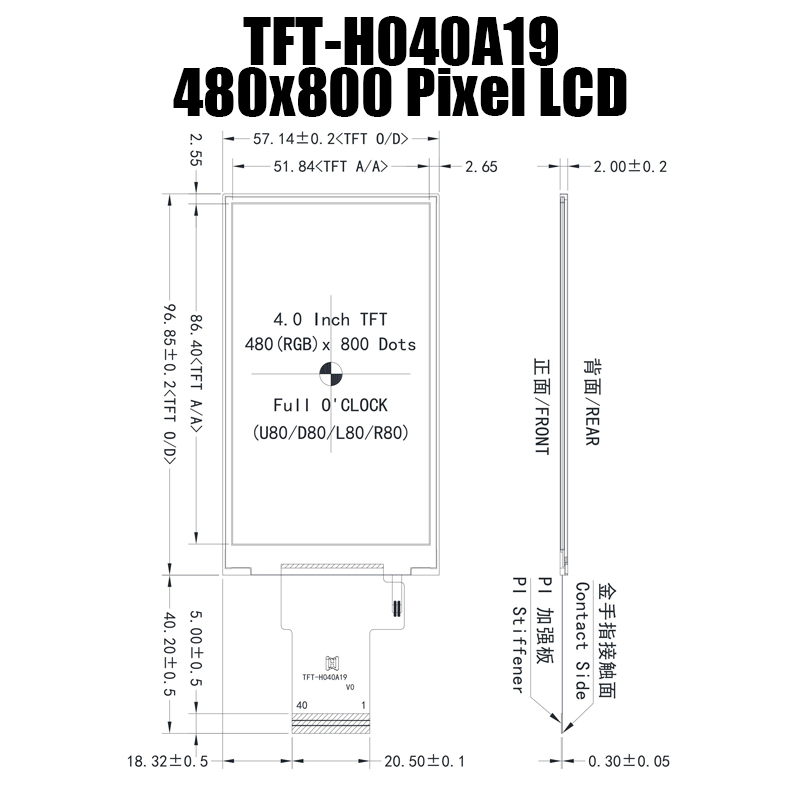 4.0 Inch IPS 480x800 Wide Temperature TFT Display Panel ST7701S For Industrial Computer TFT-H040A19WVIST5N40