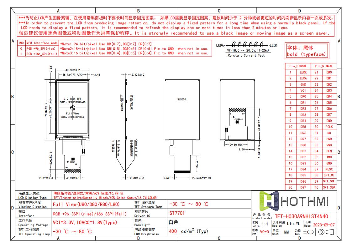 TFT-H030A9NHIST4N40 | 3.0" IPS TFT LCD Display | TFT LCD Display Manufacturer | 360x640 HD resolution | -30℃~80℃ | For industrial computer | Interface SPI | Wide Temperature