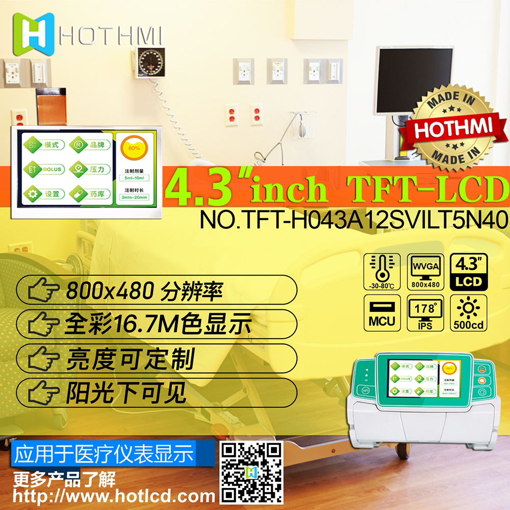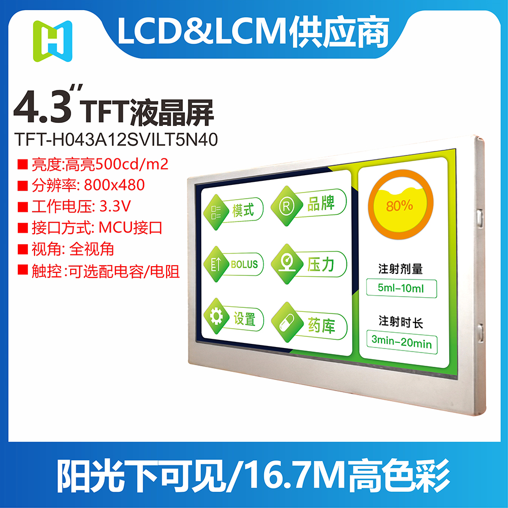 H043A12SVILT5N40是一款4.3寸超廣溫IPS-TFT搭載投射電容式觸控面板(PCAP)顯示器模塊,分辨率為800x480像素。模塊內(nèi)建ST7262+HT7381(TFT),驅(qū)動(dòng)器IC,支持MCU接口。 H043A12SVILT5N40采用IPS面板技術(shù)具有廣視角左:80 / 右:80 / 上:80 / 下:80度 (典型值);高對(duì)比度度800:1(典型值),亮度400 nits(典型值),模塊采用亮面玻璃,屏幕長(zhǎng)寬比為16:9。此款搭載的電容式觸控面板內(nèi)建GT911(CTP) IC,支持I2C接口,支持多點(diǎn)觸控功能。 H043A12SVILT5N40電源電壓 (VCC) 為3.0V至~3.6V,典型值為3.3V,模塊工作溫度為-30℃~+80℃,儲(chǔ)存溫度為-30℃~+80℃。此外,H043A1型號(hào)同時(shí)提供無(wú)觸控選項(xiàng),產(chǎn)品料號(hào)為H043A12SVILT5N40。