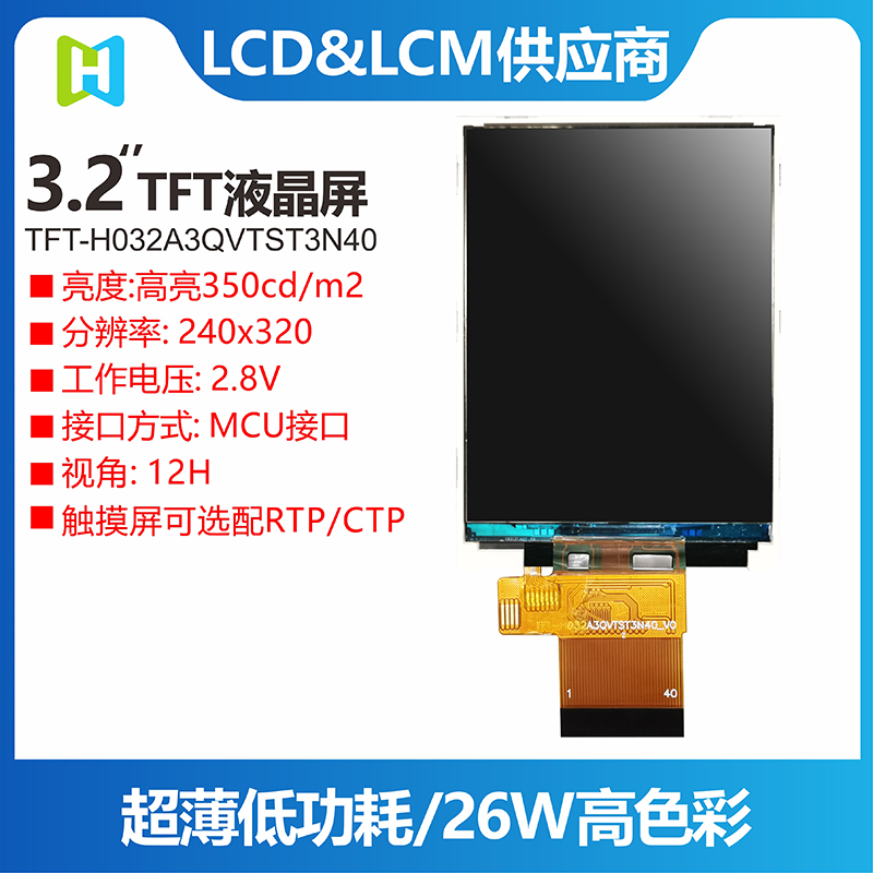 TFT-H032A3QVTST3N40是一款工業(yè)級豎屏顯示的 TFT LCD液晶屏,分辨率為240x320像素。使用7789V驅(qū)動IC,可支持MCU 8/16 位兼容 SPI接口。液晶屏typical 亮度為350 nits,視角為全視角方向;供電電壓(VCI)為2.8V~3.3V,typical 值為2.8V。工作溫度為-20℃~+70℃,儲存溫度為-30℃~+80℃。產(chǎn)品使用于各項小型智能設(shè)備,家電,監(jiān)控器等。