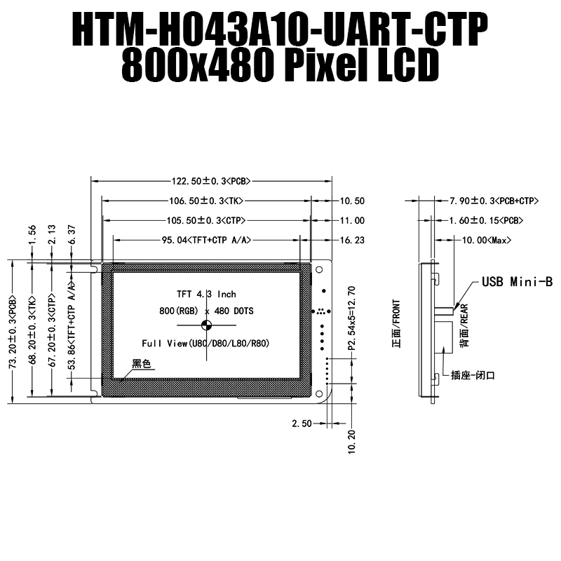 4.3英寸對角線彩色TFT屏,標(biāo)配無觸摸/電阻觸摸/電容觸摸